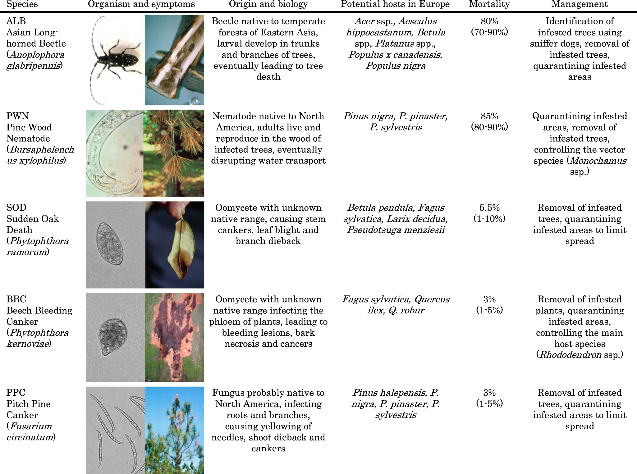- ALB (left) sourced from https://www.flickr.com/photos/99758165@N06/14770405395; released under a Creative Commons Attribution 2.0 Generic license; ALB (right) sourced from Larry R. Barber, USDA Forest Service, Bugwood.org; released under a Creative Commons Attribution 3.0 license; PWN (left) sourced from https://commons.wikimedia.org/wiki/File:Bursaphelenchus_xylophilus_male_tail.jpg; released under a Creative Commons Attribution 3.0 Unported license; PWN (right) sourced from USDA Forest Service—North Central Research Station, USDA Forest Service, Bugwood.org; released under a Creative Commons Attribution 3.0 license; SOD (left) and BBC (left) sourced from Widmer, T. L. 2010. Differentiating Phytophthora ramorum and P. kernoviae from other species isolated from foliage of rhododendrons. Online. Plant Health Progress https://doi.org/10.1094/PHP-2010-0317-01-RS. Available in the public domain; SOD (right) sourced from Joseph OBrien, USDA Forest Service, Bugwood.org; released under a Creative Commons Attribution 3.0 license; BBC (right) sourced from https://commons.wikimedia.org/wiki/File:Phytophthora_kernoviae_-_Beech_tree_infection.jpg?uselang=de, Forestry Commission; released under the Open Government License; PPC (left) sourced from https://commons.wikimedia.org/wiki/File:Esporas_de_Fusarium_circinatum.png; released under a Creative Commons Attribution Share-Alike 4.0 license; PPC (right) sourced from Terry S. Price, Georgia Forestry Commission, Bugwood.org; released under a Creative Commons Attribution 3.0 license