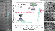 where v is the terminal dislocation velocity, b is the Burgerās vector, and Bph is a drag coefficient. In general, the absolute value of Bph has been reported to be 1.6āĆā10ā5āPaās at 298āK25 for pure Cu. Therefore, with a Burgerās vector of 2.56āĆ , the Ļph is approximately 97āMPa, which is significant when compared to the pure polycrystalline-Cu flow stress (~175āMPa9). Now from the perspective of NC materials strength, this phonon resistance may be negligible. However, in the case of NC-Ni, the reported increase in the flow stress at 103āsā1 is about two times the flow stress at 10ā3āsā1[8]. This increase can be caused by a few factors including grain growth, but the rise in flow stress in NC-Ni is more than 1āGPa indicating that the drag coefficient must be significantly higher for NC as compared to coarse-grained materials (similar to high-temperature effects). In fact, atomistic simulation of dislocation velocity results in Fig.Ā 4b indicates that addition of Ta to pure Cu increases the drag coefficient (inverse of the linear segment slope) and Fig.Ā 4c shows the density of long-wave acoustic phonons in CuāTa is higher than in pure Cu (indicative of more drag resistance). In particular, the presence of Ta in Cu induces disorder in the system and a shift of the acoustic modes toward lower frequencies is observed as Ta is introduced in Cu (Fig.Ā 4c). This could lead to an increase in the phonon drag on a dislocation as compared to the case of pure Cu. A small shift of phonon modes toward lower frequencies with increase in temperature is typical of the thermal expansion and anharmonicity27. Indeed, the increased volume fraction of interfaces/defects in NC metals is the origin of their significantly altered thermal transport properties due to increase in phonon scattering28. Following Fig.Ā 4b, the drag coefficient is inversely proportional to the slope of the linear region of the curve. Thus, the drag coefficient increases with an addition of Ta, which is in agreement with the calculated local PDOS (Fig.Ā 4c). However, in the NC-CuāTa at 300āK, the dislocation gets pinned immediately after nucleation (velocity is zero), thus, negating any effects of phonons on dislocation motion. Therefore, the unique strain-rate-insensitive response in a stable NC material stems from the stability of the controlling microstructural length scale such as the grain size and Ta nanocluster size/spacing, which act as barriers that pin/slowdown defect propagation, scatter, and absorb phonons.