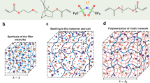 Photographs in Fig. 1b demonstrated the good transparency and stretchability of ICE. Tensile tests were carried out using ICE dumbbell samples with dimensions of 12.0 × 2.0 × 2.0 mm3. The tensile tests were performed on an electronic tensile machine with a 50-N load cell, and the stretching rate was set at 100 mm min−1. As shown in Fig. 1c, ICE possesses good stretchability, with elongation at break of ~1100%. The transmittance of ICE was measured using an UV-Vis spectrophotometer. As shown in Fig. 1d, ICE was fully transparent in visible light region, a 1-mm thick sample showed a transmittance of 92.4% at 550 nm. We measured the electrical properties by an alternating-current impedance spectroscopy. A 1-mm thick sample was sandwiched between two copper electrodes with diameter of 30 mm. Similar to liquid electrolytes and gel electrolytes, ICE showed impedance frequency dependency (Fig. 1e). The impedance magnitude (|Z|) sharply decreased and span several orders of magnitude at high frequency range (10 KHz–10 MHz), while at low frequency range (100 mHz–10 KHz), |Z| remained in the ballpark of the starting point. On the other hand, the negative phase angle (-ϕ) nearly maintained as constant at low frequency range; when the frequency increased from 1 KHz to 10 MHz, −ϕ significantly changed from ~0° to ~80°. The capacitance (Cp’) versus frequency was plotted in Supplementary Fig. 1. At low frequency range, as the testing frequency decreased, the Cp’ increased sharply and span several orders of magnitude, from 10−11 F (10 KHz) to 10−6 F (100 mHz). While at high frequency range, Cp’ maintained constant at 10−11 F. Obviously, the testing sandwich contained capacitance and resistance characteristics at the same time. These phenomena were quite different from electric conductors. We measured impedance spectroscopy of a carbon sponge (Supplementary Fig. 2), its |Z| value maintained as constant through the whole testing frequency range (100 mHz–10 MHz), so did the ϕ (~0°). Thus, when employing ionic conductors, the applying frequency needs to be well considered. We read the bulk resistance (114 KΩ) of ICE from the Nyquist plot of impedance spectrum (Supplementary Fig. 3)27,28. Its conductivity was about 1.27 × 10−7 S cm−1 at room temperature (20 °C), calculated by the equation σ = L/SR, where L corresponded to the thickness of ICE, S corresponded to the effective overlap area, and R corresponded to the bulk resistance. ICE exhibited higher conductivity as the temperature increased, as shown in Fig. 1f, the conductivity of ICE was 6.80 × 10−5 S cm−1 at 200 °C. This can be explained as follows: higher temperature contributed to more intense movement of polymer chains and ions, resulting in easier ion transport and higher conductivity.
