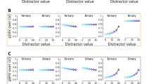 Adaptation is a characteristic feature of single neuron computation in sensory processing7 and extends to value coding in reward-related brain areas, including midbrain dopaminergic nuclei and OFC26,33,36. Our results extend these neural findings to the behavioral domain, showing that—consistent with recent theoretical findings36—value-guided choice behavior also adapts to the recent reward environment. These adaptive changes in choice performance follow in principle from previously demonstrated value-coding changes, though establishing a definitive link between adaptation in value-coding activity and in choice behavior will require further study. In sensory processing, adaptation does not always reliably improve discriminability for stimuli similar to the adapter and often drives other changes in perceptual performance34 (e.g., biases). While our results show a change in value-guided discriminability, adaptation to reward statistics could also produce other changes in choice behavior such as preference biases, particularly under different adaptation conditions (see Supplementary Discussion).