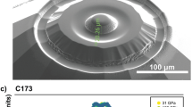 Single-crystal diamond is well characterized, and although it is the hardest known material, properties such as hardness and brittleness are anisotropic13,14,15. Cleaving along {110} planes with orientations parallel to the [001] compressive stress may act as the principal trigger for anvil failure15. Thus, preventing cleaving along the {110} planes is key in generating ultrahigh pressures. It is known that NCD and/or nanopolycrystalline diamonds (NPD) have high toughness and isotropic mechanical properties due to the randomly oriented nanosized diamond grains16. The use of NCD or NPD diamond anvils has been shown to generate pressures up to 1 TPa7,8,9. Interestingly, flat NPD diamond anvils with culets ranging in size from 300 to 500 μm have been shown to generate pressures that are ~1.5–2.0 times higher than their single-crystal anvil counterparts. However, beveled NPD diamond anvils with smaller culets (<200 μm) did not show any significant improvement in maximum pressure generation over single-crystal diamond anvils16. Micro-NPD beveled anvils with a culet of 3 µm and a bevel diameter of 10 µm crafted with focused ion beam (FIB) achieve pressures greater than 600 GPa17 when measured by the equation of state (EOS) reported in ref.8.