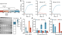 RIP2CARD (435–540) cloned into pETM40 (KanaR) was transformed into BL21 star (Thermo Fisher Scientific) for expression. All LB precultures contained 2% glucose to repress the lac operon. NMR-specific labels (all isotopes from Eurisotop) were introduced by expression at 22 °C overnight in 1.5 fold M9 medium following the 2-fold concentration method66. For uniform 13C and 15N labelling, M9 medium was supplemented with 0.7 g L−1 15N NH4Cl and 2.5 g L−1 13C-glucose. For sparse labelling with [2-13C]- or [1,3-13C]-glycerol, to measure long range constraints, the protocol previously described67 was used. Deuteration was achieved by using D2O instead of H2O for all medium components.