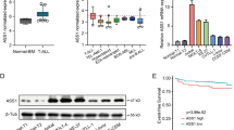 The 293T, JURKAT, and CCRF-CEM cells were purchased from American Type Culture Collection (ATCC). Human T-ALL cell lines SIL-ALL, HPB-ALL, KOPTK1, CUTLL1, and DND41, and murine T-ALL cell lines T6E, G4A2, and 8946 were kindly provided by Dr Warren Pear (University of Pennsylvania). T-ALL cell lines were grown in complete RPMI-1640 (Hyclone) supplemented with 10% fetal bovine serum (FBS, Hyclone), 1% penicillin/streptomycin (Hyclone), 1% non-essential amino acids (Gibco), 2 mM l-glutamine (Sigma), 1 mM sodium pyruvate (Sigma), and 100 μM β-mercaptoethanol (Sigma). Primary T-ALL cells were co-cultured with MS5-DL1 feeder cells in WIT-L medium supplemented with stem cell factor (SCF) (50 ng ml−1), interleukin (IL)-2 (10 ng ml−1), IL-7 (10 ng ml−1), and insulin-like growth factor-1 (10 ng ml−1)47. Human normal bone marrow cells were maintained in minimum essential medium-α supplemented with 20% FBS and granulocyte-colony stimulating factor (50 ng ml−1). The 293T cell was maintained in Dulbecco's modified Eagle's medium (DMEM; Hyclone) containing 10% FBS and 1% penicillin/streptomycin (Hyclone). All cell lines were authenticated using the variable number of tandem repeats PCR assay, cultured for fewer than 6 months after resuscitation, and tested for mycoplasma contamination every 3 months using MycoAlert (Lonza)48. Human primary specimens were obtained with informed consents from Center for Medical Genetics, Ghent University, Ghent, Belgium; Center for Cancer Research, Boston University School of Medicine, Boston, USA; Guangzhou Institutes of Biomedicine and Health, Chinese Academy of Sciences, Guangzhou, China; Union Hospital and Tongji Hospital, Wuhan, China.
