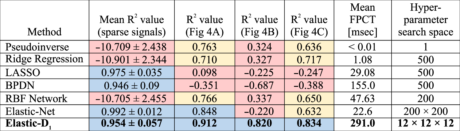 1. Average and standard deviation of R2-values for measurements of sparse spectra consisting of a single laser line at 11 different wavelengths evenly spaced on the range λ=[1555 nm, 1565 nm] and broadband spectra (black curves in Fig. 4). For each reconstruction technique, we include the average fixed-parameter compute time (FPCT) required to solve the corresponding problem (shown in Table 1) and the dimensionality/size of the hyperparameter space used. Calculations were all performed on a laptop with an Intel Xeon E3-1505M v5 CPU and 16 GB of RAM. Blue shaded boxes correspond to R2 values above 0.8, yellow is for R2 between 0.6 and 0.8, and red is for R2 less than 0.6. The results indicate that the elastic-D1 algorithm consistently and accurately reconstructs both sparse and broadband input signals