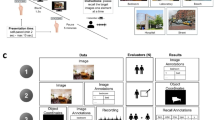 The three images per category were chosen to contain a high memorable, a medium memorable, and a low memorable image, based on prior memorability data from an online memory test with thousands of participants37,38. Memorability here means HR (percentage of hits among repeats) in a continuous old/new task with on average 80 participants viewing each image. Memorability was used as an image selection metric in order to ensure there were no biases in memorability of the stimuli, and to see whether memorability could predict successful recall. High memorable and low memorable images were selected to be at least 0.5 SD away from the mean in the distribution found in Isola et al.37, (M = 67.5, SD = 13.6). As a result, high memorable images had a mean HR of 85.1% (SD = 5.65, min = 75.0, max = 94.9), whereas low memorable images had a mean HR of 41.3% (SD = 9.6, min = 18.9, max = 53.6), both significantly different from each other (t(58) = 21.54, p = 2.33 × 10−29). Medium memorable images (used only as foils in the experiment) had a mean HR of 65.9% (SD = 6.39). Images were selected to have equally low FA rates, so that HR alone can be used as the main memorability metric (low memorable versus high memorable: t(58) = 1.63, p = 0.11; high memorable versus medium memorable: t(58) = 0.21, p = 0.833; low memorable versus medium memorable: t(58) = 1.82, p = 0.074). High memorable and low memorable stimuli showed no significant differences in low level visual features, including spatial frequency or color (R,G,B), tested with the Natural Image Statistical Toolbox50. Both high memorable and low memorable stimuli were also judged to be equally good exemplars of their scene category on a scale of 1 (poor example) to 5 (good example; low memorable: M = 4.13, SD = 0.66; high memorable: M = 3.98, SD = 0.70; t-test: t(29) = 0.95, p = 0.351; see Online scoring experiments in the Methods), showing that these images were well counterbalanced across conditions.