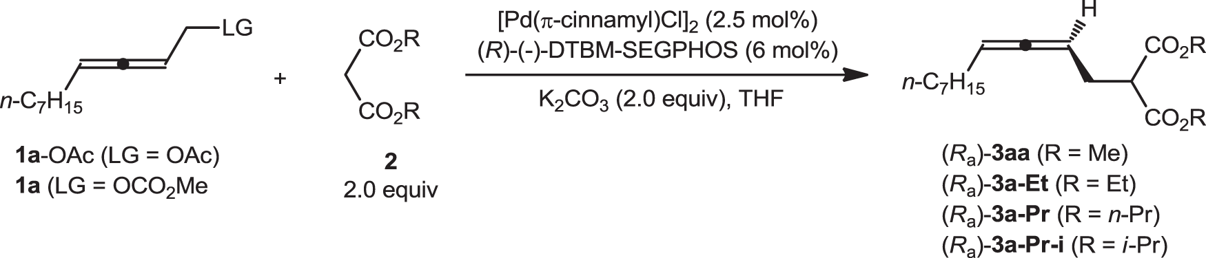 1. Procedure A: [Pd(π-cinnamyl)Cl]2 (0.005 mmol), (R)-(−)-DTBM-SEGPHOS (0.012 mmol), and K2CO3 (0.4 mmol) in NMP (1.0 mL) were stirred first at 30 °C for 30 min, then 1a-OAc (or 1a) (0.2 mmol)/NMP (0.5 mL) and malonate (0.4 mmol)/NMP (0.5 mL) were added sequentially and the resulting mixture was stirred at 30 °C