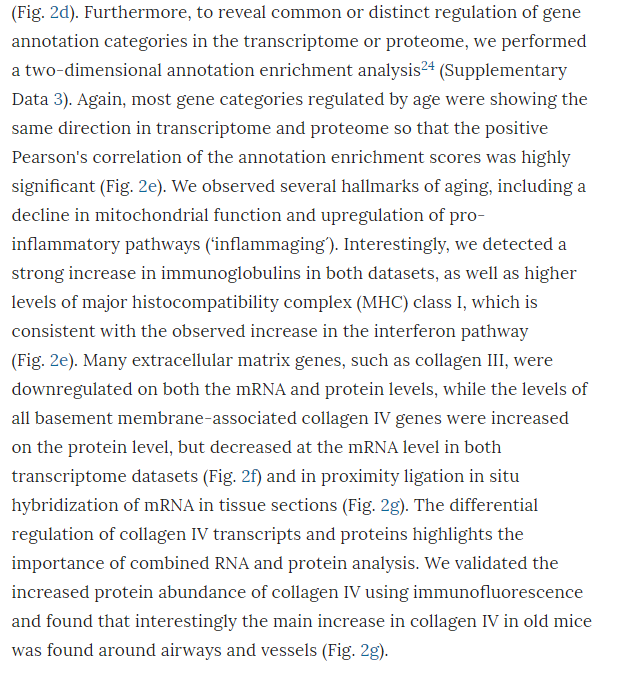 Prediction of the upstream regulators23 of the observed expression changes in either the transcriptome or proteome data gave very similar results (Fig. 2d). In both datasets from independent mouse cohorts, we discovered a pro-inflammatory signature, which included upregulation of Il6, Il1b, Tnf, and Ifng, as well as the downregulation of Pparg and Il10 (Fig. 2d). Furthermore, to reveal common or distinct regulation of gene annotation categories in the transcriptome or proteome, we performed a two-dimensional annotation enrichment analysis24 (Supplementary Data 3). Again, most gene categories regulated by age were showing the same direction in transcriptome and proteome so that the positive Pearson's correlation of the annotation enrichment scores was highly significant (Fig. 2e). We observed several hallmarks of aging, including a decline in mitochondrial function and upregulation of pro-inflammatory pathways (‘inflammaging´). Interestingly, we detected a strong increase in immunoglobulins in both datasets, as well as higher levels of major histocompatibility complex (MHC) class I, which is consistent with the observed increase in the interferon pathway (Fig. 2e). Many extracellular matrix genes, such as collagen III, were downregulated on both the mRNA and protein levels, while the levels of all basement membrane-associated collagen IV genes were increased on the protein level, but decreased at the mRNA level in both transcriptome datasets (Fig. 2f) and in proximity ligation in situ hybridization of mRNA in tissue sections (Fig. 2g). The differential regulation of collagen IV transcripts and proteins highlights the importance of combined RNA and protein analysis. We validated the increased protein abundance of collagen IV using immunofluorescence and found that interestingly the main increase in collagen IV in old mice was found around airways and vessels (Fig. 2g).