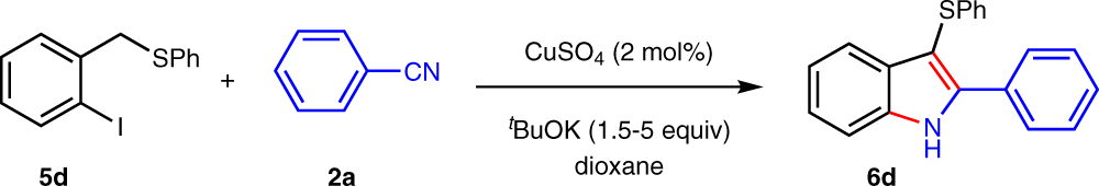 1. aConditions: 5d (1 mmol), 2a (1.5–5 mmol), CuSO4 (2 mol%), tBuOK (2–5 mmol), dioxane (0.75 mL), argon. Yields were determined by 1H NMR