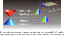 The intensity of each grating coupler was collected from CCD, and the intensities IG1 and IG2 scattered from the upper (G1) and lower (G2) ports can be extracted with a high signal-to-noise ratio, after subtracting the noise that mainly arises from background radiation. The extracted intensities IG1 and IG2 reflect the amount of light transmission that is coupled to the upper- and lower-propagating valley-dependent edge states, respectively. To experimentally qualify directional coupling efficiency of routing devices, we define the experimental directionality as \(\kappa _{\exp } = \left( {I_{G1} - I_{G2}} \right)/\left( {I_{G1} + I_{G2}} \right)\). The full-band directionality can be measured by tuning the operation wavelength of the excited waves. Figure 4h shows the directionality spectra as a function of wavelength. In the bandgap, a strong and broadband directionality was observed. For anticlockwise-phase-vortex excitation, the incident light couples to valley-dependent edge states propagating along the upper interface (red line in Fig. 4g). The directionality of the topological routing device is up to 0.5 within a broadband region. Note that the maximum \(\kappa _{\exp }\) is up to ~0.895, implying a 18:1 extinction ratio between G1 and G2. When the handedness of the excitation flips, so do the propagation directions of the valley-dependent edge states (blue line in Fig. 4h). For comparison, the low-directionality spectra for the control experiment were depicted in Fig. 4i. There are a few discrete wavelengths to reach \(| {\kappa _{\exp }} |\) > 0.5. A more experimental description is presented in Supplementary Note 5.