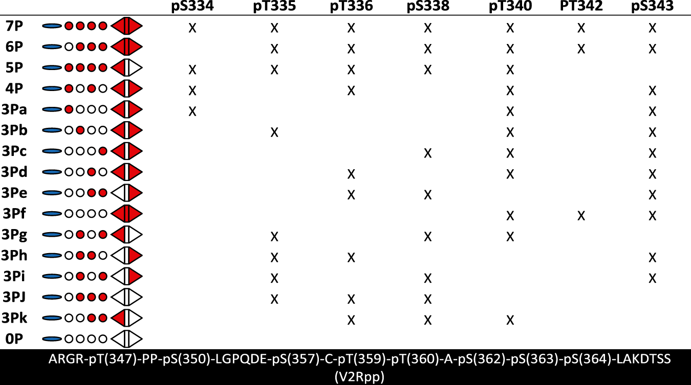 1. The amino acid sequence of each peptide was identical (CDDEASTTVSKTETSQVAPA), and the peptides differed only regarding which serine and threonine residues were phosphorylated. The peptide sequence was derived from the bovine rhodopsin C-terminus with an N-terminal cysteine introduced to allow fluorescent labeling of the peptides. The fully phosphorylated C-terminus of V2 vasopressin receptor (V2Rpp, sequence indicated in black box) was included to have an additional reference in the trypsin digest assay and the fluorescence anisotropy experiments. For fluorescence anisotropy experiments, the V2Rpp was fluorescently labeled during the chemical synthesis at the N-terminus of the peptide
