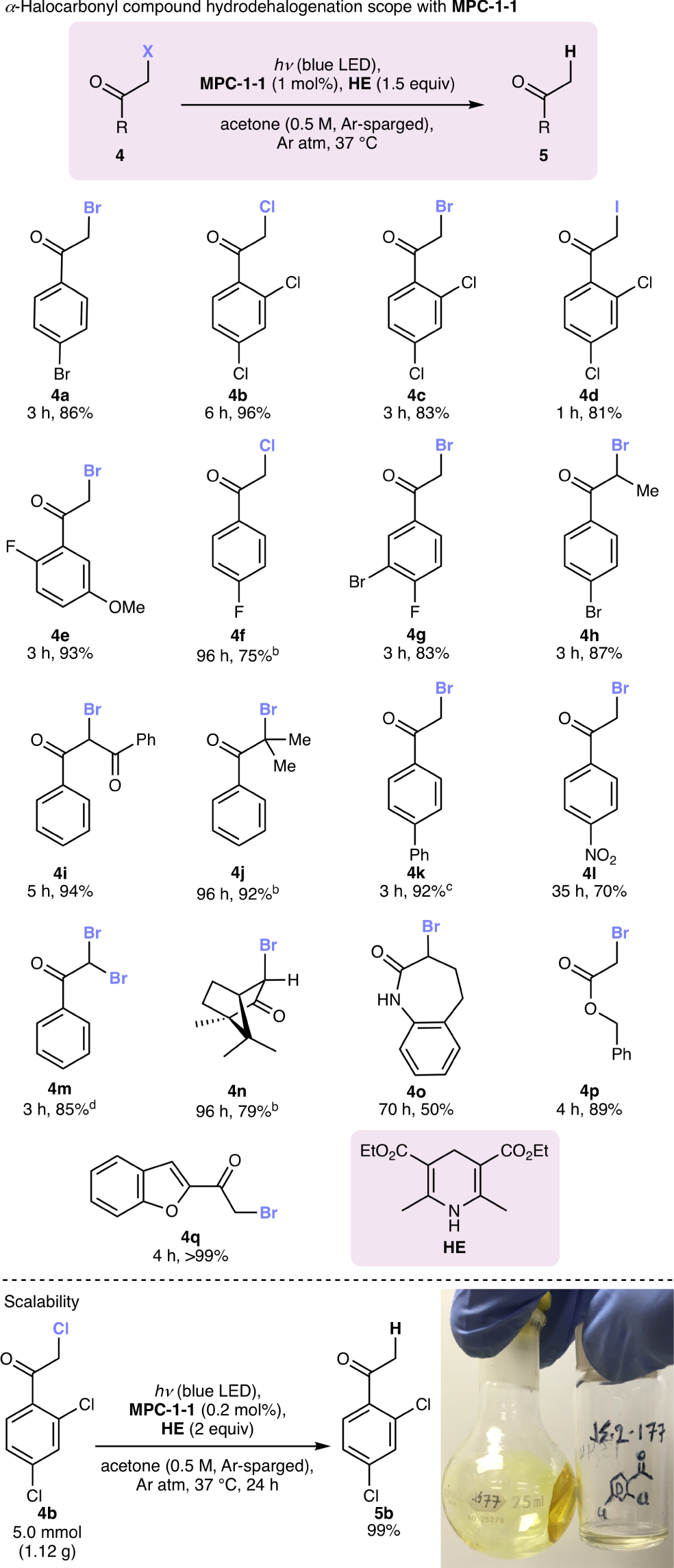 Table 2 α-Halocarbonyl compound hydrodehalogenation scope and scalability with MPC-1–1a