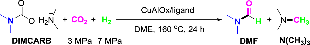 1. aDIMCARB (0.5 mmol, equal to 1 mmol HNMe2), CuAlOx (100 mg, 9 mmol% Cu), ligand (10 mol%), 1,2-Dimethoxyethane (4 mL), 3 MPa CO2, 7 MPa H2, 160 °C, 24 h