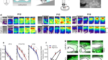 To consistently align the stimulus grid for each cell recorded, the x axis of the grid was centered on the soma and the y axis was aligned with the second row of the grid placed on the L1/2 border. We chose the latter because it is the most prominent laminar boundary in the ACx. We measured the following spatial coordinates for each cell: distance from the soma to the pial surface, L1/2 border, and the horizontal distance to the anterior tip of the hippocampus (where the fimbria exits). The latter measurement was our center reference point (x = 0) to assign each cell to either an anterior, middle or posterior cluster within the ACx. The size of the ACx in the mouse is ~ 1.5 mm42, therefore we mapped cells located at 480 ± 42 μm (mean ± standard error of the mean (SEM)) anterior and posterior to our center reference (x = 0, Fig. 3a) in both hemispheres.