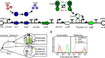 For every experiment, an overnight LB culture was started from the freezer stock of each relevant strain. The next day, saturated cultures (OD600 ~3) were diluted 104–105-fold in M9. For non-optogenetic experiments, media was distributed in culture tubes (3 mL per tube), inoculated with the appropriate inducers, and incubated in a shaker operating at 250 RPM and 37 °C until the OD600 reached between 0.08 and 0.15 (6–9 h depending on initial density and strain). When indicated, saturating concentrations of xylose (0.5%) and IPTG (500 μM) were used. Inducer concentrations used in Fig. 6 were 0.00917% xylose and 10.0 μM IPTG. In optogenetic experiments, media was distributed (500 µL per well) in 24-well dark-walled clear-bottomed plates (ArcticWhite AWLS303008). Next, the appropriate inducers were added, and plates were sealed with adhesive foil (VWR 60941-126). Plates were mounted onto LPAs running the appropriate light exposure programs, and incubated until the OD600 reached between 0.08 and 0.15. Culture tubes or plates were then transferred to ice. 100 µL of each sample was transferred to a flow cytometry tube containing 1 mL PBS for measurement.