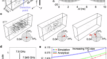 A 1 mm diameter YIG sphere is located in the intersection of the cross-cavity. The YIG magnon mode follows the Kittel dispersion equation \(\omega _m = \gamma \mu _0(H + H_a)\), where μ0 is the vacuum permeability, γ = 2π × 26.0 GHz T−1 is the gyromagnetic ratio and μ0Ha = 3.0 mT is the anisotropy field of the YIG sphere. The static magnetic field H is applied perpendicularly to the plane of the cross-cavity.