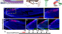 TACs are committed and proliferative direct lineage of primed SCs8. For most of the mammalian organs, upon the completion of development or regeneration, the TACs vanish and tissue growth stops9. TACs induction, maintenance, and differentiation therefore must be rigorously controlled and directed by molecular signaling and cellular microenvironment. In the case of regeneration, SCs can also be re-activated to produce new TACs when the tissues of interest receive stimulating (activating) signals, such as molecular cues for regeneration released by wounded tissues10. To date, most research focuses on epithelial tissues, such as intestinal epithelium, which have lifelong persistent TACs5,11, while in hair follicles, keratinocytes contain periodic TACs that reenter the cell cycle7. Discovering how the signaling pathways control TACs to SCs communications is challenging, partially due to the fact that most of tissues do not possess sufficient amounts of SCs, TACs, and differentiated cell populations at the same time, and importantly in close vicinity. However, in the tissues involved in epithelial–mesenchymal interactions, while the epithelial SCs and TACs are often investigated, the neighboring mesenchymal compartment’s SCs and niche have been less documented.