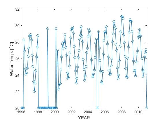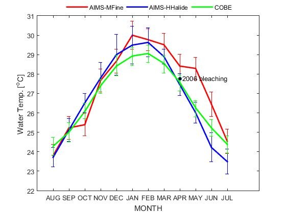The publication of Fine et al. (2019) is very important in documenting ecological changes (in terms of percentage coral covers) at Low Isles. However, Fig. 1.c. raises some comments. First, the water temperature data is claimed to be originated from the monthly AIMS 1996-2016 data converted from the AIMS daily data. This data formerly called ‘1 m – AIMS’ in their publication is renamed as ‘AIMS-MFine’ in this comment. It important to note that Fine et al. (2019) does not provide procedures on handling the AIMS data set in their paper. This data set, however, is different than the water temperature data set downloaded from the AIMS website. The original AIMS monthly data that is converted from the daily data set contain many missing data. For instance, there is no data for the whole year of 1998, and from years 2011 to 2016. The original AIMS data referred as ‘AIMS-HHalide’ is presented in Figure 1. Here, the missing monthly data are assigned an arbitrary value of 20 oC. Both ‘AIMS-MFine’ and ‘AIMS-HHalide’ data sets are than compared to an independent data set, the COBE data set. This monthly global data called ‘sst.mon.mean.nc’ is publicly available and can be fully downloaded from the ESRL-NOAA website. This independent data, assigned as ‘COBE’, is kept only data covering from January 1996 to December 2010 period for our comparison purpose. The monthly mean and its standard deviation of all data sets are plot in Fig. 2. Note that, since we are unable to obtain Fine et al.’s data, their monthly temperature averages and standard deviations are reproduced using an online tool available from a website at https://apps.automeris.io/wpd/. It also important to note that Fine et al. (2019) does not provide procedures on handling the AIMS data set in their paper. Second, we quantify the strength of relation and closeness between temperature curves using the Pearson Correlation and RMSE (Root Mean Square Error), respectively. These two measures and their associated error estimates are calculated using the formulas available in Dingman and Ferry (1956), Makridakis et al. (1998), and Faber (1999). The Pearson correlation and RMSE between ‘AIMS-HHalide’ and ‘COBE’ are 0.99 ± 0.01 and 0.55 ± 0.11 oC, respectively while the correlation and RMSE between ‘AIMS-MFine’ and ‘COBE’ are 0.94 ± 0.03 and 0.93 ± 0.19 oC, respectively. While their Pearson correlations are comparable, it is clear that the ‘AIMS-HHalide’ curve is much closer to ‘COBE’ than ‘AIMS-MFine’ curve by the RMSE measure. Third, a less-severe bleaching in the month of April 2006 is also plot in Fig. 2. This bleaching data is obtained from the bleaching data set called 'Bleaching database V1.0' as described in Donner et al. (2017). Using the ‘AIMS-MFine’ curve, this less-severe bleaching in April would not be occurring since the temperature when the bleaching happened was still within the lower experimentally acclimatizing limits of bleaching temperature, i.e. 3-6 oC cooler (Schoepf et al., 2019). It is, therefore, concluded that the data plotted as the ‘AIMS-MFine’ in Fig. 1.c of Fine et al (2019) should be re-checked and corrected.