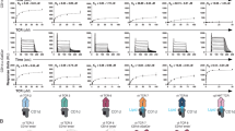 We next determined the TCR sequences used by the CD1d–α-GlcADAG tetramer+ cells that were sorted as single cells from both wt and Jα18−/− BALB/c thymi, following tetramer-associated magnetic enrichment (TAME) based on gates depicted in Fig. 1d and Supplementary Fig. 1b. CD1d–α-GalCer+ CD1d–α-GlcADAG tetramer− type I NKT cells from wt mice were also sorted as controls. Single cell TCR α- and TCR β-chain paired analysis was performed using multiplex PCR, as previously described26 (Supplementary Table 1). CD1d–α-GalCer tetramer+ cells are known to express the canonical Vα14Jα18+ type I NKT TCR α-chain rearrangement27. In contrast, approximately half (12 out of 25 paired TCR sequences) of the CD1d–α-GlcADAG tetramer+ sorted cells expressed Vα10Jα50 TCR α-chain rearrangements, similar to the Vα10+ NKT cells present in Jα18−/− mice that we previously described25. Interestingly, four CD1d–α-GlcADAG tetramer+ clones from wt BALB/c mice expressed a TCR α-chain in which the Jα50 gene was rearranged with Vα15, Vα4, Vα11, or Vα4.4, instead of the Vα10 gene. These TCR α-chains displayed little or no homology in their CDR1α and CDR2α regions, yet possessed highly similar CDR3α regions suggesting that the Jα50-encoded region confers CD1d–α-GlcADAG recognition in the context of different Vα gene usage. This may be due to the conservation of the CDR3α residues Ser109, Ser110 and Phe113 in each of these TCRs, three residues that were involved in the recognition of CD1d–α-GlcCer complexes by Vα10Jα50+ NKT TCRs25. The different CDR1α and CDR2α loops may also facilitate CD1d binding in different ways. Indeed, in a previous study we demonstrated that a Vα10Jα50+ NKT TCR utilised residues within the CDR1 and CDR2 loops to establish contact with CD1d, whilst conserved CDR3α residues contacted both CD1d and the antigen25. Interestingly two unique TCR α-chain sequences that did not express Vα14, Jα18 or Jα50 gene segments (Vα4Jα17, Vα8Jα49) were also identified amongst wt thymocytes sorted with CD1d–α-GlcADAG tetramers (Supplementary Table 1). TCRβ sequence analysis indicated diversity within the composition and length of the CDR3β regions amongst all sorted populations, and they almost exclusively used Vβ8 (24 out of 25 paired TCR sequences), consistent with predominant Vβ8 gene usage within type I NKT cells9, Vα10Jα50+ NKT cells25, and type II NKT cells28. Some TCR sequences with identical TCRα and TCRβ nucleotide homology were identified in independently sorted cells (Supplementary Table 1), suggesting clonal expansion in vivo.
