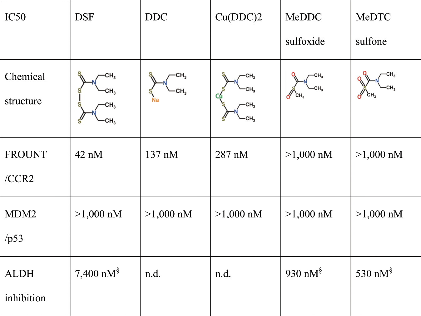 1. IC50 values from inhibition experiments with disulfiram (DSF) and its metabolites, sodium diethyldithiocarbamate (DDC), DDC–copper complex (Cu(DDC)2), S-methyl-N,N diethylthiocarbamate sulfoxide (MeDTC sulfoxide), S-methyl-N,N-diethylthiocarbamate sulfone (MeDTC sulfone).