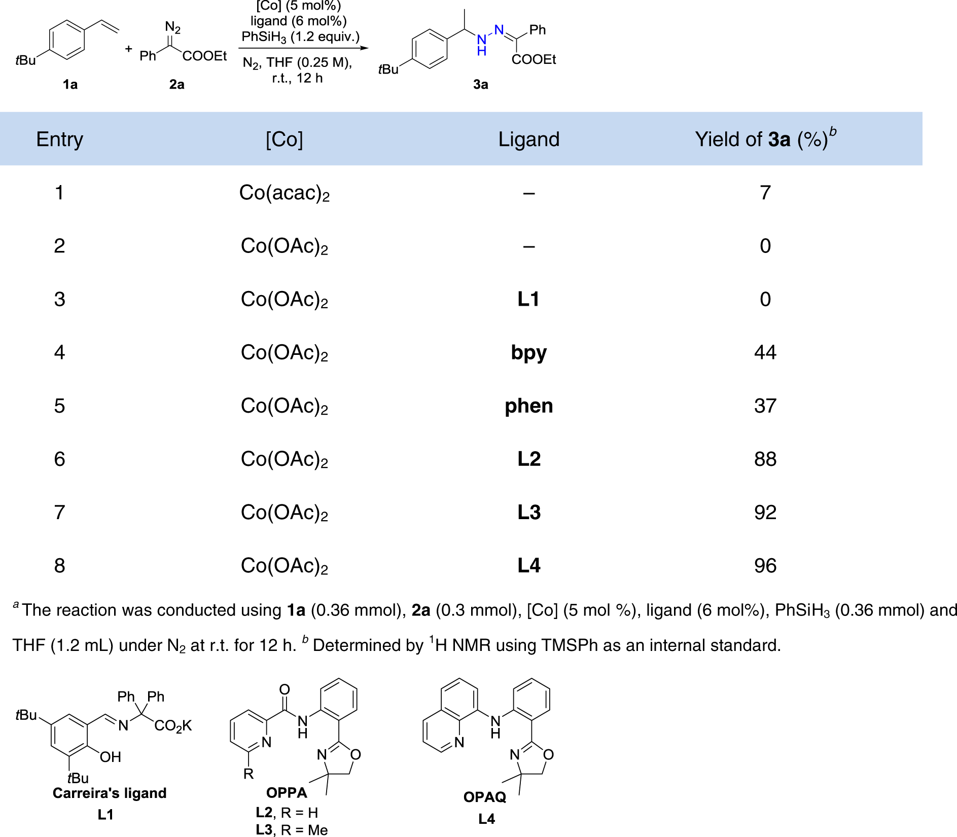 1. aThe reaction was conducted using 1a (0.36 mmol), 2a (0.3 mmol), [Co] (5 mol %), ligand (6 mol%), PhSiH3 (0.36 mmol), and THF (1.2 mL) under N2 at r.t. for 12 h