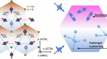 Figure 1d provides a schematic diagram of our sample configuration. Below the Néel temperature 420 K, the spins on Mn atoms order in an inverse triangular spin structure, where the spins form a 120° order with negative vector chirality in the ab plane. Such a noncollinear antiferromagnetic spin in the Kagome bilayer is characterized by cluster magnetic octupole moments18, which macroscopically breaks time-reversal symmetry and is expected to result in the appearance of Weyl nodes14,15,16,17,18. The small net magnetization occurs in the ab plane by slight canting of the 120° order. Note that the large AHE is not explained by the small net magnetization but rather attributed to the cluster magnetic octupole12. An external magnetic field is applied normal to the film surface to align the cluster magnetic octupole along z-direction as well as the small magnetization vector. Thus, the electric field parallel to the sample surface (x-direction) induces the anomalous Hall conductivity \(J_y = \sigma _{xy}E_x^{{\mathrm{in}}}\) as well as the longitudinal conductivity \(J_x = \sigma _{xx}E_x^{{\mathrm{in}}}\), which are measured in this work in THz frequency.