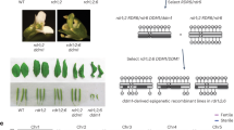 All tomato plants used in this study are Solanum lycopersicum cv M82. A. tumefaciens strain AGL1 containing the CRISPR/Cas9 construct was used to transform tomato. In brief, tomato seeds were surfaced sterilized in 70% ethanol for 2 min followed by 2.2% sodium hypochlorite for 15 min and rinsed in sterilized water five times. The sterilized seeds were transferred to ½ strength Murashige-Skoog (MS) medium with vitamins, 0.8% agar, 1.5% sucrose. Cotyledons from 7-day-old plants were cut in two and submerged in a solution of Agrobacterium in MS liquid medium with 3% sucrose at OD600 = 0.5. The explants were then dried on filter paper and placed on a plate (1X MS medium, 0.6% agar, 0.5 mg/L 2,4-D) under dim light. After two days cultivation, the cotyledon segments were transferred to a selective regeneration medium (1X MS medium, 1X Nitsch vitamins, 0.1 g/L Myo inositol, 2% sucrose, 0.4% agar, 320 mg/L Timentin, 25 mg/L Cefotaxime, 2 mg/L Zeatin riboside, 100 mg/L Kanamycin). The later appearing shoots were transferred to a selective rooting medium (1X MS medium with vitamins, 2% sucrose, 2.25% gelrite, 320 mg/L Timentin, 50 mg/L Kanamycin). Regenerates with shoots and roots were then transferred into soil and genotyped. Primers for sgRNA amplification and mutant genotyping were listed in Supplementary Data 3.