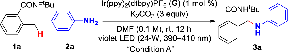 1. aUnless noted, the reactions were carried out using 1a (0.1 mmol), 2a (3 equiv), photocatalyst (1 mol %), base (3.0 equiv), and DMF (1 ml), under Ar, and stirred at rt for 12 h under 24-W violet LED irradiation.