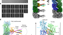 To elucidate the structural basis of FtsZ recognition, we crystallized the SepF C-terminal core domain (SepFΔML) in complex with a 10-residues peptide comprising the conserved C-terminal domain (CTD) of FtsZ (FtsZCTD, Fig. 2b) and determined the crystal structure at 1.6 Å resolution (Supplementary Table 1). The SepF structure revealed a symmetric homodimer, with monomers that contain a central four-stranded β-sheet stacked against two α-helices (α1, α2) involved in dimerization and capped by a C-terminal α-helix (α3) on the opposite side of the sheet (Fig. 2c). The homodimer contains two identical FtsZCTD-binding pockets, each made up of residues coming from both protomers (Fig. 2d), defining a dimeric functional unit for the SepF–FtsZ interaction. This 2:2 binding stoichiometry can explain mechanistically why B. subtilis SepF has a bundling effect on FtsZ protofilaments34. Corynebacterial SepF has a similar capability, as shown by FtsZ polymerization assays at different SepF concentrations (Fig. 2e). Even at sub-stoichiometric amounts of full-length SepF, the data showed an immediate influence on polymerization dynamics and a strong FtsZ bundling effect. Comparable changes on FtsZ polymerization were also observed for the C-terminal core alone (SepFΔML) but not for a SepF double mutant (SepFK125E/F131A, see below) that is unable to bind FtsZ (Supplementary Fig. 7a, b), excluding the possibility that the light scattering signal could result from SepF polymerization alone. Furthermore, visualization of the protein mixture by negative stain electron microscopy (EM) after 10 min of incubation clearly showed thick bundles of FtsZ protofilaments, as well as highly curved filaments (Fig. 2f). Filaments and bundles were not observed in the absence of nucleotide or with SepF alone. Moreover, GTP and the slowly hydrolyzable analog GMPCPP produced a similar FtsZ bundling behavior, suggesting that GTP hydrolysis is not required for bundling (Supplementary Fig. 7c). We also showed that SepF did not significantly affect the GTPase activity of FtsZ (Supplementary Fig. 7d), in agreement with previous results on B. subtilis SepF22.