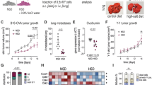 For the analysis of the effect of the combination of HSD and angiotensin-converting enzyme inhibitor (captopril) treatment in the subcutaneous implantation tumour model, mice were subcutaneously injected with 1 × 106 cells (B16F10 or 4T1) into the left armpit after 1 day of starvation. Then, mice were randomly assigned to four groups (6 mice per group) via random lottery: the NSD group, HSD group, captopril group or combined HSD and captopril groups. Mice were fed the NSD or HSD for 16 days. Meanwhile, mice in the captopril group received captopril (10 mg kg−1 d−1) by gavage every day. At day 16, we measured tumour size with callipers and weighed the tumour samples upon harvest. Captopril was purchased from Dalian Meilun Biotech Co., Ltd. (Dalian, China).