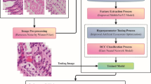 The feature extraction pipeline consisted of three steps: nucleus segmentation, nucleus-level feature extraction, and image-level feature extraction (Fig. 2). First, cell nuclei in whole-slide images were segmented by a hierarchical multilevel thresholding approach29 (Fig. 2a). Next, for each segmented nucleus, 10 nucleus-level features were calculated (Fig. 2b). Representative image patches of the 10 nucleus-level features are shown in Table 2. Lastly, since each whole-slide image contains millions of cell nuclei, each type of nucleus-level features was dissected into 15 image-level features by combining a 10-bin histogram and 5 distribution statistics (mean, std, skewness, kurtosis, and entropy) (Fig. 2c). The bin centers of the histogram were cluster centroids determined by clustering each type of nucleus-level features sampled from the training set; hence, the histogram features are comparable across patients. The naming rule of the 15 image-level features is shown in Fig. 2c, using the nucleus-level feature (e.g., ratio). In total, we calculated 150 image-level features for each whole-slide image. More details can be found in the “Methods” section.