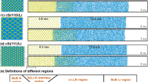 where \(E_{{\mathrm{tot}}}^0\) and \(E_{{\mathrm{tot}}}^D\), are the total energies of the supercell without and with a defect, respectively, and \(\mu _i^0\) is the standard state chemical potential (DFT calculated energy per atom) of the element i. The standard state elements are α-U, diamond-Si and graphite. \(\Delta N_i^D\) is the number of atoms of type i added (\(\Delta N_i^D\) > 0) or removed (\(\Delta N_i^D\) < 0) from the perfect supercell to create the defect, and the sum is over all added and removed elements. Δμi is the change in the chemical potential of element i resulting from an N-phase equilibrium (i.e., from the local environment), which can be calculated by solving the set of linear equations: