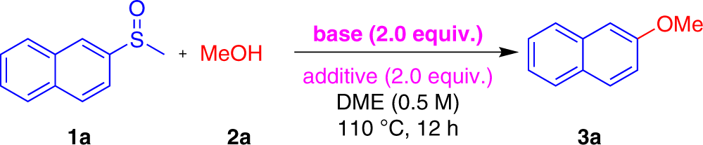 1. aReaction conditions: 1a (0.2 mmol), 2a (0.4 mmol), base (0.4 mmol) and additive (0.4 mmol) in DME (0.4 mL) under argon atmosphere at 110 °C for 12 h.
