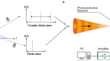 The frequency resolution estimate provided above is valid assuming that the detection bandwidth is high enough to resolve the sampling pulses; otherwise, one should rather consider the temporal width of the detected pulses for this estimate (Δtd ← Δtp). In our particular experimental realization, the full-width at half-maximum (FWHM) of the sampling pulses was Δtp ∼ 7 ps, whereas the FWHM after photo-detection (i.e. in intensity) was measured to be about twice this value, Δtd ∼ 14.4 ps, see Supplementary Fig. 2. This corresponds with a theoretical frequency resolution \(\delta \omega _{\mathrm{r}} \approx \Delta t_{\mathrm{d}}/\left| {\ddot \phi } \right|\) ~ 2π × 340.3 MHz. Note that the limited detection bandwidth does not modify the time resolution of the calculated SP, whose amplitude FWHM width is given by \(\delta t_{\mathrm{r}} \approx \left| {\ddot \phi } \right| \times \Delta \omega _p\sim 5.9\,{\mathrm{ns}}\). Thus, a longer time resolution can be obtained by use of a sampling pulse with a broader frequency bandwidth, practically limited only by the operation bandwidth of the dispersive line used in the system. As mentioned, the frequency resolution will however remain limited by the detection bandwidth. The highest frequency resolution offered by the system (inverse of the SP time resolution) can be exploited only if a detection stage is available with a sufficiently large bandwidth to capture the sampling pulse time width (with no distortion). Additional experiments are reported in Supplementary Fig. 3 that validate further the derived time–frequency resolution estimates.