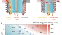 Herein, we report electrochemical CO2 reduction to formic acid vapors using an all-solid-state reactor. The formic acid vapor product can either be easily condensed as high-concentration liquid fuel or directly fed into a gas phase reactor for its following applications. Our design can avoid the challenges caused by the usage of liquid electrolytes and can generate high-purity and high-concentration formic acid. Besides, all-solid-state reactors are suitable for modular and high-pressure systems in future large-scale deployments. As shown by the schematic in Fig. 1a, the cathode and anode were separated by a PSE layer. On the cathode side, CO2 can be selectively reduced to formate ions on a selective CO2RR catalyst; on the anode side, instead of using liquid acid for the oxidation reaction that could complicate the device level engineering, here we fed in a H2 gas stream for the hydrogen oxidation reaction (HOR) to release protons. Gas diffusion layer (GDL) electrodes coated with CO2RR and HOR catalysts were used as cathode and anode to improve the mass transfer of both CO2 and H2. Besides, both catalysts were in close contact with anion and cation exchange membranes (AEM and CEM), respectively, for efficient ion transportation. Electrochemically generated HCOO− and H+ were driven by the electric field to move across the AEM or CEM into the PSE layer, and were recombined to form HCOOH molecule. Instead of using a DI water stream to discharge the product, which would significantly bring down the formic acid concentration, here we report the use of an inert gas (N2) flow to carry away formic acid vapors for high-concentration products. When using a DI water flow stream to get high concentration of pure formic acid solutions, the flow rate should be lowered, while maintaining the product generation rate. As the formic acid concentration within the solid electrolyte layer gets higher and higher, the Faradaic efficiency (FE) is dramatically decreased due to the potentially increased reverse reaction rate, as well as the increased crossover to the anode as frequently observed in fuel cells47,48. However, by using N2 gas flow to bring out the formic acid vapors, the gas flow rate can be kept high so as to avoid the accumulation of products within the solid electrolyte layer. High concentration of formic acid can still be obtained by a simple cold-condensation process, while the N2 stream can go back to the reactor. As a result, we can achieve concentrated products while not sacrificing much selecticity compared with the DI water flow design. Coupling with a high-activity (formate partial current densities > 440 mA cm−2), high-selectivity (maximal FE > 97%), and high-stability (100 h) grain boundary (GB)-enriched bismuth (Bi) catalyst, we demonstrated high concentrations of pure formic acid solutions (up to nearly 100 wt.%) condensed from its vapor by tuning the gas flow stream through the PSE layer, representing a superior catalytic performance compared with the existing systems (Fig. 1b and Supplementary Table 1).
