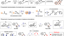 For their structural resemblance to morphinan alkaloids, the hasubanan alkaloids have attracted attention of synthetic chemists for over half a century. Since the first elegant total syntheses of (±)-hasubanonine (3), (±)-cepharamine (4), and (±)-metaphanine by Ibuka in early 1970s10,11,12, innovative strategies have been developed to construct the unique propellane structure of this important family of natural products13,14,15,16,17,18,19,20,21,22,23,24,25. However, the first asymmetric total synthesis was accomplished only in 1998 by Schultz and Wang using a chiral auxiliary approach26. A dozen years later, the Herzon group developed in 2011 an efficient asymmetric synthesis of both the hasubanan27,28 and the acutumine families of alkaloids29,30,31. Diastereoselective addition of alkynyl lithium 13 to N-methyl iminium 14 at −90 °C afforded key intermediate 15 as a single detectable diastereomer (Fig. 1c). Concurrently, Reisman and co-workers designed a general strategy involving a diastereoselective addition of Grignard reagent 16 to chiral N-tert-butanesulfinimine 17 for the generation of C14 tetrasubstituted stereocenter in 18 (Fig. 1d)32. A divergent synthesis of (-)-8-demethoxyrunanine and (-)-cepharatines A (5), C (6), and D (8), belonging to the hasubanan subgroups B and C, respectively, were successfully realized from the common intermediate 18. More recently, Kim’s group completed the total synthesis of (-)-runanine and the formal synthesis of (-)-8-demethoxyrunanine as well as (−)-cepharatine D (8)33. Treatment of enantioenriched chiral amino ester 19 (ee 97%) with KOtBu at 0 °C afforded enolate 20, which underwent 5-exo cyclization to afford pyrrolidine 21 (ee 95%) with a memory of chirality effect (Fig. 1e). The common feature of these three approaches is the installation of the chiral α-tertiary amine (C14) at the beginning of the synthesis. A completely different strategy implicating the generation of C13 quaternary carbon stereocenter was designed by Trauner and co-workers for the total synthesis of (-)-sinoracutine (9)34. Thus oxa-Michael addition of 22 to phenyl vinyl sulfoxide (23) afforded 24 (NaH, THF, then KH, 0 °C to rt), which, upon heating in 1,2-dichlorobenzene (NaHCO3, 176 °C), underwent syn-elimination of sulfenic acid to afford the chiral allylic enol ether. The Claisen rearrangement of the latter furnished then the aldehyde 25 with perfect chirality transfer from C6 to C13 (Fig. 1f). Emanating from this study, a plausible mechanism responsible for the facile racemization of (-)-sinoracutine was proposed to rationalize the discrepancy in the reported optical rotation value of this structurally unique natural product. To the best of our knowledge, no divergent total synthesis of all three sub-types of hasubanan alkaloids (B, C, D, Fig. 1a) has been reported to date.