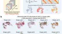 We next applied dissipative particle dynamics (DPD) polymer simulations59 to reconstruct the 3D structures of haploid X chromosomes (Supplementary Fig. 16a) in individual cells using the snHi-C data (Fig. 5a, Supplementary Fig. 16b). The chromatin fiber path in these structures is strictly determined by the pattern of contacts derived from the snHi-C experiments and, thus, reflects the actual folding of the X chromosome in living cells60. As revealed by TAD annotation, the DPD simulations successfully reproduced chromatin fiber folding even at short and middle genomic distances because TAD positions along the X chromosome were largely preserved between the models and the original snHi-C data (Fig. 5a, Supplementary Figs. 17, 19a, b; also see “Methods”). Moreover, the simulations correctly reproduced chromatin folding at the scale of the whole chromosome with a well-defined A-compartment (Fig. 5a, Supplementary Fig. 18). Additionally, to validate the simulation results using an alternative approach, we performed multicolor in situ fluorescence hybridization (FISH) with two intra-TAD probes and one probe located outside the selected TAD. The distributions of inter-probe spatial distances extracted from the X chromosome model closely resemble those of the FISH analysis (Supplementary Fig. 19c). Taken together, these observations confirm the validity of our approach.