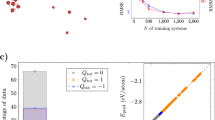 The DFT reference data has been generated using the all-electron code FHI-aims62 employing the Perdew–Burke–Ernzerhof63 (PBE) exchange-correlation functional with light setting. The total energy, sum of eigenvalues, and charge density for all systems except Au2-MgO were converged to 10−5 eV, 10−2 eV, and 10−4 e, respectively. For the Au2-MgO systems stricter settings have been applied by multiplying each criterion by a factor 0.1 in combination with a 3 × 3 × 1 k-point grid. Spin polarized calculations have been carried out for the Au2-MgO, NaCl and Ag3 systems. Reference atomic charges were calculated using Hirshfeld population analysis40. In principle any other charge partitioning scheme could be used in the same way.