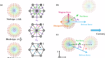 Figure 3e–h shows the simulated magnetization states at equilibrium under different in-plane biaxial compressive strains \(\varepsilon _{{\mathrm{in-plane}}} = \varepsilon _{\left[ {110} \right]} = \varepsilon _{\left[ { - 110} \right]}\) obtained from Supplementary Fig. 6, with E = +0, −4, −0, and +4 kV/cm, respectively. The average interfacial DMI strength under these electric fields, D = 0.772, 0.585, 0.685, and 0.727 mJ/m2, respectively, are directly extracted from Fig. 2b. Overall, the simulations (Fig. 3e–h) agree well with results from MFM imaging (Fig. 3a–d). Figure 3e shows the equilibrium magnetization state under zero strain and D = 0.772 mJ/m2 (+0 kV/cm), relaxed from a uniform upward (+z) magnetization. When applying \(\varepsilon _{\mathrm{in-plane}} = - 0.189\%\) and D = 0.585 mJ/m2 (−4 kV/cm), multiple skyrmions appear (Fig. 3f). As mentioned above, since the reduction of D does not favor the formation of skyrmions, the observed skyrmion creation is attributed to the reduction of the Keff by the compressive in-plane compressive strains (note that the Pt/Co/Ta multilayer has a negative magnetostriction24). Being consistent with experiments, the created skyrmions can be retained (Fig. 3g) after turning off the electric field (−0 kV/cm), at which \(\varepsilon _{\mathrm{in-plane}} = - 0.034\%\) and D = 0.685 mJ/m2. However, neither this small remanent strain nor the slightly enhanced D are the key factors for retaining the skyrmions, because the simulations shows that created skyrmions can be retained even when εin-plane is set to 0 and D remains to be 0.585 mJ/m2 (Supplementary Fig. 14). This control study indicates that the spatially heterogenous magnetic parameters in a polycrystalline system are the key to the retainment of the created skyrmions. For example, the spatial variation of uniaxial local magnetic anisotropy mimics the presence of local pinning sites. Simulations results studying the influence of such parametric heterogeneity, average grain size, size of computation cell, and room-temperature (298 K) thermal fluctuation on skyrmion creation are provided in Supplementary Figs. 15—19. Finally, when applying \(\varepsilon _{\mathrm{in-plane}} = - 0.010\%\) and D = 0.727 mJ/m2 (+4 kV/cm), the overall morphology of the skyrmion state (Fig. 3h) remains largely the same compared to that in Fig. 3g, partly because the reduced εin-plane and the slightly enhanced D act against and in favor of stabilizing the skyrmion state, respectively.