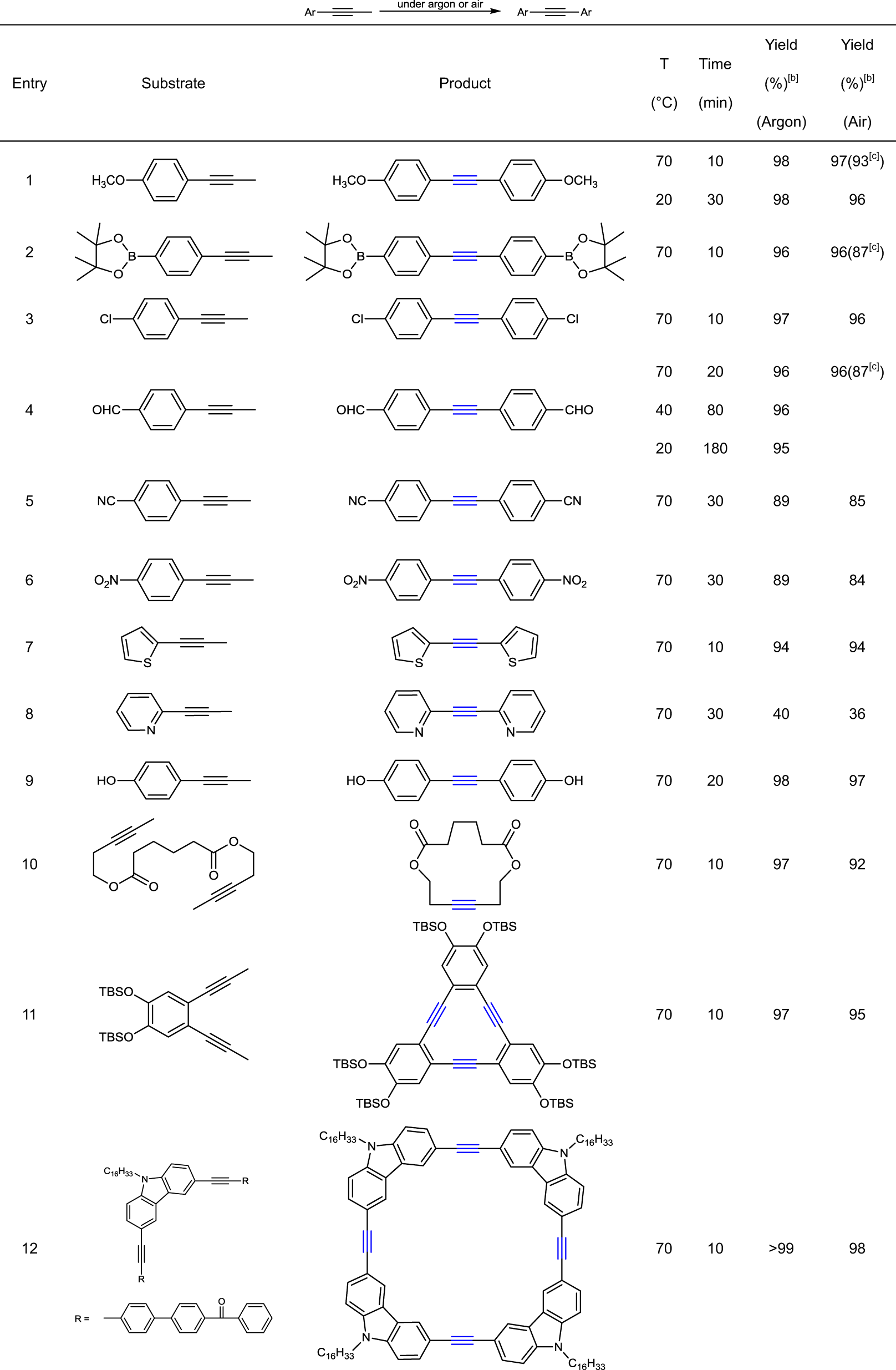 Table 2 Homodimerization, RCAM, and cyclooligomerization reactions of propynyl substrates either under argon or air conditiona.