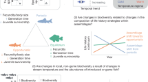To assess climate change threats to freshwater fishes, we focused on climate extremes rather than hydrothermal niche characteristics in general, because extremes are more decisive for local extinctions and potential geographic range contractions16,17. We quantified climate extremes using long-term average maximum and minimum water temperature (Tmax, Tmin), maximum and minimum flow (Qmax, Qmin), and the number of zero flow weeks (Qzf), based on the weekly hydrograph and thermograph of the hydrological model. Water temperature is considered the most important physiological threshold for fish species, as mortality of ectothermic species occurs above and below lethal thresholds8,46. Decreases in minimum flow directly affect riffle-pool systems and connectivity between viable habitat patches, leading to a rapid loss of biodiversity47. We included the number of zero-flow weeks because increases in the frequency of dry-spells directly correlates with reduction in diversity and biomass due to the loss of suitable aquatic habitat47. We considered maximum flow because increases in high flow might reduce abundance of young-of-the-year fish by washing away eggs and displacing juveniles and larvae, impeding them from reaching nursery and shelter habitats47,48.