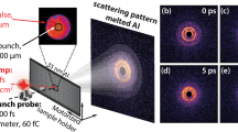 Ultrafast heating pulses with a wavelength λ = 13.6 nm are produced using an XUV-FEL operating in the self-amplified spontaneous emission (SASE) beam mode. The kinetic energy of the electrons is 680 MeV and the radiation is produced using a 12 mm gap undulator. The XUV pulse energy is measured by gas monitor detectors on each shot, allowing us to determine the energy density of each measurement. The pulse width of ~150 fs FWHM is estimated based on the measured electron bunch length using the transversely deflecting RF-structure. The XUV pulses are transported to the FLASH BL3 experimental area with four grazing incidence mirrors. The total efficiency of these mirrors is estimated to be 70%. The XUV pulse is then focused by a Mo/Si multi-layer coated super-polished spherical mirror, whose nominal radius of curvature is 6,850 mm and a peak reflectivity of 67% at 13.6 nm. The samples are placed before focal spot of the mirror so that a larger area on sample can be heated. The XUV spot size on target is measured by spatially scanning a pyro-detector with a 50 μm diameter pin-hole mounted on its front surface, and its energy distribution is fitted by Gaussian profiles indicating vertical and horizontal FWHM of 255 μm and 225 μm, respectively. Half of the FEL energy is enclosed in the FWHM area, resulting in the maximum intensity of 5 × 10 11W/cm2 on target. About 77% of the incident XUV energy is deposited in the 30 nm thick gold foils40, and the energy density gradient along the longitudinal direction is expected to smooth out within 500 fs after the excitation by ballistic electron energy transport and thermal diffusion (see Supplementary Information).