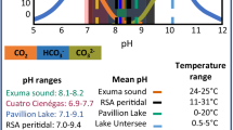 Porewaters and pond waters were aliquoted through 0.2 µm syringe filters into vials for geochemical analyses. Approximately 10 mL were dispensed into plastic tubes for temperature, pH, and salinity measurement and discarded. Temperature and pH were measured by an electrode (WTW 3310 pH meter with SenTix 41 pH probe) calibrated with NBS buffers daily at pH 4, 7, and 10. Salinity was estimated with an optical refractometer (ATAGO S-28E). Two mL were dispensed into microcentrifuge tubes with 100 µL of 3% zinc acetate for sulfate and sulfide concentration measurement, 4 mL were dispensed into borosilicate glass vials with conical polypropylene-lined caps for titration of total alkalinity, and 1 mL was dispensed via a needle into helium-flushed 12 mL borosilicate vials (Labco Exetainer 9RK8W) with 100 µL of 42% H3PO4 and sealed with chlorobutyl septa (Labco VW101) for determination of DIC concentration and δ13C values. Following pore fluid sampling, cores were split with a circular saw on a jig with the blade depth set to the tube wall thickness, followed by a wire to split the sediment into even halves. Graphic logs of vibracore sedimentology, prepared with Sedlog33, are shown in Supplementary Fig. 2 and Supplementary Fig. 3.
