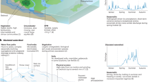 where Δh is the average local surface slope (0.022 m m−1). With a mean value for hydraulic conductivity (K) of 0.28 m d−1, we determine a spatially averaged weathering crust throughflow velocity of 0.028 m d−1 and a specific meltwater discharge of 0.0018 m3 d−1. Typically, at our study site located within the western sector of the Greenland Ice Sheet, ablating bare-ice and, by inference, its hydraulically active weathering crust is exposed, on average, for around 70 days (or 76%) of the summer melt season20,38. Accordingly, using our derived mean and maximum vt values, respectively, only 22 to 66% of the catchment’s weathering crust area delivers interstitial meltwater directly to the stream network seasonally (Fig. 1b).