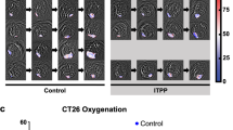 Samples were collected in 4% buffered formaldehyde, dehydrated, embedded in paraffin and cut into 5 µm sections and stained after antigen retrieval. Hematoxylin/eosin and Masson’s trichrome stains were performed according to standard protocols. The following antibodies were used for immunohistochemical staining: pan-B cytokeratin (CkpanB, Dako, M3515, dilution 1/50), HIF1α (Abcam, ab16066, dilution 1/400), HIF2α (Abcam, ab199, dilution 1/50), carbonic anhydrase 9 (CA9, Abcam, ab15086, dilution 1/3000), glucose transporter 1/SLC2A1 (GLUT1, Millipore, 07-1401, dilution 1/1000), PECAM1 / CD31 (Dako, M0823, dilution 1/10), ETS transcription factor (ERG, Roche, 790-4576, prediluted) and vimentin (VIM, Dako, M7020, dilution 1/250). For histological analyses, 5 random images of tumor areas of stained slides were taken at 40x magnification. Stained areas were isolated by color deconvolution and thresholding. Quantification of staining intensity was measured on thresholded areas, converted onto a scale from 0 (white, no staining) to 100 (black, completely stained) and compared between the sample taken before ITPP treatment and the one after. For calculation of percentage area stained, thresholded areas were compared to the complete area of the picture. ImageJ (V1.53c, National Institutes of Health, USA) was used for all histological analyses58.