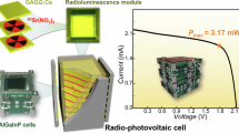 In some particular applications, such as equipment for outer planet exploration and undersea detection, energy supply is usually challenging due to the absence of light and difficulties in charging or replacing power sources. These facilities may operate continuously for more than 10 years at places without human beings and this calls for energy systems that can generate energy themselves and work for a long time. Nuclear batteries (NBs)1, which convert energy from radiation sources into electricity appeal to above applications due to their extremely long working lifetime and high stability against harsh conditions. Recently, the radioluminescent NBs have been researched extensively due to the possibilities of higher energy conversion efficiency and protection of terminal semiconductors2,3. Such kind of battery consists of three parts, namely, radiation source, scintillation layer, and photovoltaic device (PVD). The scintillation layer converts radiation energy into light emission and then, the PVD converts these photons into electricity. There is no doubt that the high efficiency of scintillator, radioluminescence (RL) spectrum consistent with the response of PVDs, perfect coupling between luminescent materials and PVDs are the dominating factors to achieve high conversion efficiency. Besides, a good stability of the scintillator against radiation and environmental attack is the basis of NB’s stability.