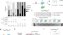 For BFP disruption assay and indel pattern analysis, 15,000 HEK 293T cells/well were seeded the day before transfection in poly-d-lysine-coated 96-well plates (Biocoat Poly-d-Lysine, Fisher Scientific). On the next day, a medium change was performed, which was followed by the transfection of 140 ng Cas9- or sRGN-expression plasmid plus 60 ng gRNA-expression plasmid using LipoD293 (SignaGen) as a transfection reagent according to the manufacturer’s instructions. The medium was changed 24 h later. Seventy-two hours post transfection medium was removed, and cells were trypsinized in 25 µL TrypLE (Gibco) for 15 min at 37 °C and diluted with 100 µL PBS. Ten microliters of the sample was lysed by adding 0.5 µl DNA Release additive (B93, Thermo Fisher Scientific) and 20 µL Dilution buffer (F1325ML, Thermo Fisher Scientific) and incubated for 5 min at room temperature followed by 98 °C for 2 min. For mRNA transfection, murine Hepa 1–6 cells were plated in 24-well plates at a density of 50,000 cells per well. After incubation for 2 hr, cells were transfected with 0.25 µg of nuclease mRNA and 0.25 µg of sgRNA per well using Lipofectamine MessengerMAX (Thermo Fisher Scientific) by following the manufacture′r’s instructions. Cells were collected 3 days after transfection and genomic DNA was extracted using the DNeasy Blood & Tissue Kit (Qiagen) following the manufacturer’s instructions. Parental 293FT and the homozygous IVS40 293FT cell line (2 × 105 cells) were transfected with 2 µg of a sRGN3.1 expression plasmid and with either T428 sgRNA or T428 surrogate sgRNA by using Lipofectamine 3000 (Thermo Fisher Scientific Scientific). Genomic DNA was extracted 7 days after transfection with DNeasy Blood & Tissue Kit (Qiagen). A fragment containing the editing region was amplified using PCR with the appropriate primers (Supplementary Table 3) and used for TIDE analysis.
