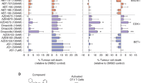 MCLA-145 binds with high affinity to CHO cells expressing either human CD137 or PD-L1 and to activated human T cells as determined by flow cytometry (Supplementary Fig. 2a). The affinity of MCLA-145 for its targets was assessed by surface plasmon resonance (SPR) with recombinant proteins and confirmed in a cell-based system where the targets are in their native conformation (Fig. 2a, b). By SPR, MCLA-145 was shown to bind PD-L1 (0.51 ± 0.05 nM) and CD137 (1.9 ± 0.2 nM) with high affinity (Supplementary Table 2). MCLA-145 was capable of binding to both targets simultaneously on an SPR sensor (Fig. 2c). The cell-based affinity of MCLA-145 for human PD-L1 and human CD137 in native conformation was confirmed by Scatchard analysis (0.49 ± 0.03 nM and 2.02 ± 0.02 nM respectively) using radiolabeled antibody (Supplementary Table 3). The affinity and binding kinetics of MCLA-145 are in the same range as comparator antibodies atezolizumab* and avelumab* for PD-L1 (Fig. 2a) and urelumab* and utomilumab* for CD137 (Fig. 2b).