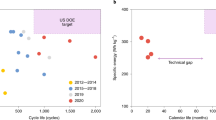 Considering the ambiguous use of ‘specific energy and energy density’ within the research of Si/Si-B/Si-D||IC cells (i.e. misuse of energy values obtained at different calculation levels), it is necessary to give an explicit definition of this term depending on the technology readiness level (TRL). Figure 6F schematically portrays the evolution of energy density from a low TRL (i.e. materials discovery and testing in laboratory research) to a high TRL (industrial battery pack assembly). At the material level, a number of enticing values have been reported in the literature, such as high specific energy of 700 Wh kg−180. However, these values decrease drastically after shifting to the cell level when the mass of the electrolyte, separator, current collectors, and conductive additives are included in the calculation of the specific energy and energy density (see Supporting Fig. 1 for details). In general, various factors can be discounted when translating the Si electrode specific capacity to the practical specific energy and energy density of a Si/Si-B/Si-D||IC cell. Our calculations and those from other groups84, indicate that an improvement of >20% in terms of specific energy and energy density can be achieved for Si/Si-B/Si-D||IC cells compared to current Li-ion cell technology.