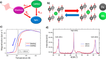 Figure 4b shows the time evolution of the integrated signal in each range. The injection of electrons into the unoccupied states takes place near zero delay (we recall that our system’s response function is 150 fs) and then rapidly decays (red empty circles), the process being finished by about 500 fs. The intensity at the position of the Fe minority peak starts to grow already during the laser excitation (filled blue circles), due to both the modification of the electronic structure and the Fermi level smearing. More specifically, this modest intensity growth starting at t = 0 is linked to the presence of an instantaneous increase in the density of states peaking right above the Fermi level (see Fig. 2b, t = 0 ps) and can be considered as a precursor of the metamagnetic phase transition. However, it is only about 300 fs after the excitation that the electronic density corresponding to the minority band peak displays a sharp increase, associated with a persistent band structure modification. The characteristic time delay tD and subsequent rise time τ of the transition are obtained by fitting the integrated electron density at the Fe minority peak region with an error function (see “Methods”) and yields values of tD = 350 ± 30 fs and τ = 220 ± 110 fs. In addition, the data represented by black diamonds in Fig. 4b, which indicate the time-dependent population of bands in a region below EF, nearly mirror the population of the unoccupied levels up to 300 fs, with a fast depletion and recovery. The curve stabilizes thereafter at a finite value, implying permanent modifications of the deeper bands already after 300 fs, during which the Fe minority peak is still shifting toward its final position at 150 meV below EF. Similar differences in the behavior of the electronic density at and below the Fermi level have been observed during ultrafast demagnetization process in Fe17 and Co18. In the present case, this behavior shows that the FOPT in FeRh is mediated by a transient electronic phase in which the electronic structure is different from both the AFM and FM phases. This precursory phase exists in a delay range from time zero up to 500 fs after laser excitation.