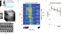 Almost all chronic recording studies examining stability in the visual cortex have used simple parameterized stimuli, such as oriented drifting gratings, as they present straightforward measurements for determining the stability of individual neuron response properties. These studies are largely in consensus, finding a high degree of stability with respect to orientation tuning, spatial frequency tuning, and size tuning18,22,36, although responses to such stimuli may be susceptible to longitudinal reduction as a result of repeated stimulus presentation37. Previous work has characterized the existence of small subnetworks of highly stimulus-responsive neurons coexisting against a backdrop of relatively unresponsive neurons38,39, and a recent study reports these highly active neurons to be particularly stable amidst contextual modulation factors40. Responses to grating stimuli are also found to be stable following monocular deprivation25 and even apical or basal dendritic ablation41. However, gratings are designed to optimally stimulate the receptive fields of visual cortical neurons and have simple visual statistics compared to an animal’s natural visual input. In addition, orientation tuning is widely believed to be “hardwired” early in development42,43,44,45, and iso-oriented neurons exhibit high connectivity46,47 likely serving to stabilize orientation responses through ongoing Hebbian plasticity47,48. Ensembles of neurons driven by naturalistic stimuli are not necessarily iso-tuned, and almost certainly exhibit lower levels of intrinsic connectivity. As a result, there may be considerably more representational drift in response to naturalistic stimuli than to gratings, particularly over long time periods (weeks to months)49.